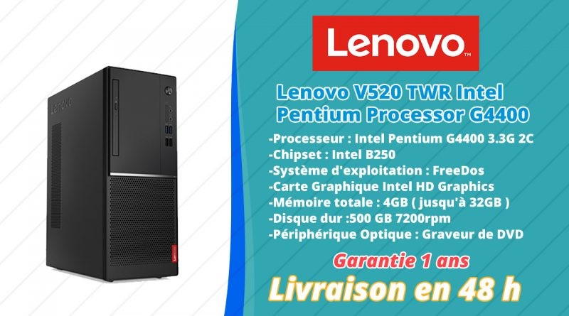 Lenovo V520 TWR Intel® Pentium® G4400 Processor (3M Cache, 3.30 GHz), Freedos - 4GB DDR4- Disque Dur 500GB 7200 RPM - DVD+/-RW Drive - Intel® Integrated Graphics, WiFi / LAN et Bluetooth : Ethernet 10/100/1000M (Wake-on-LAN), 6 USB 3.0 / 2 USB 2.0 / 1 VGA / 1 HDMI / 1 DisplayPort / 1 Série / 1 Parallele / 1 RJ45 / 3 ports audio /Lecteur SD 7-en-1, Clavier / Sourie : Francais / USB, 1 an de garantie